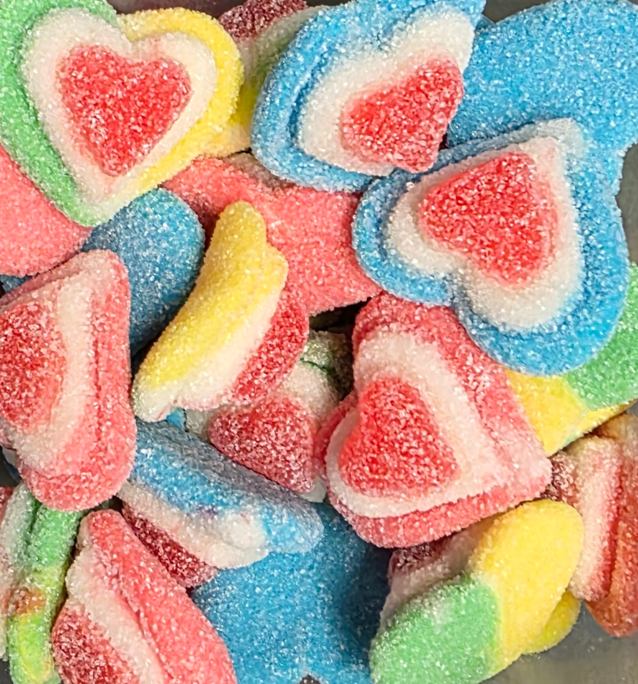 Délicieux jujubes en formes de cœurs triples.
